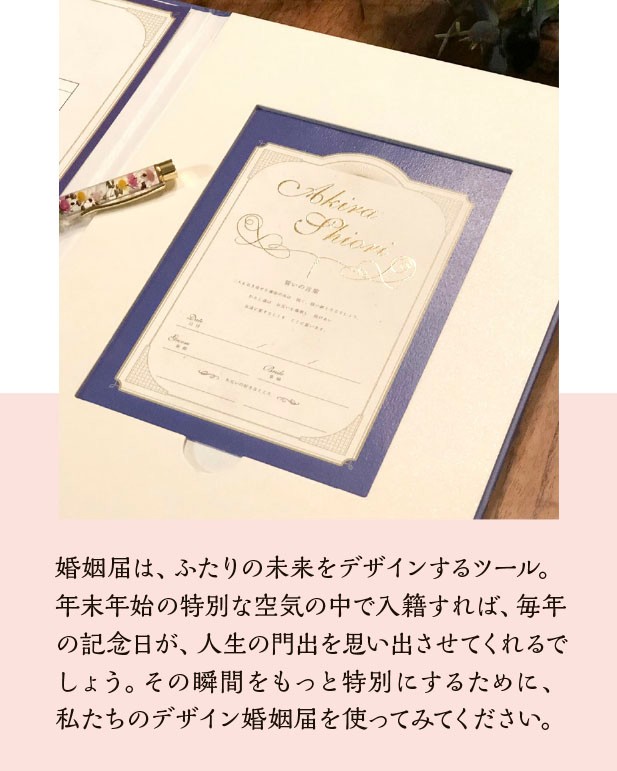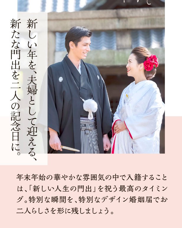 婚姻届は、ふたりの未来をデザインするツール。年末年始の特別な空気の中で入籍すれば、毎年の記念日が、人生の門出を思い出させてくれるでしょう。